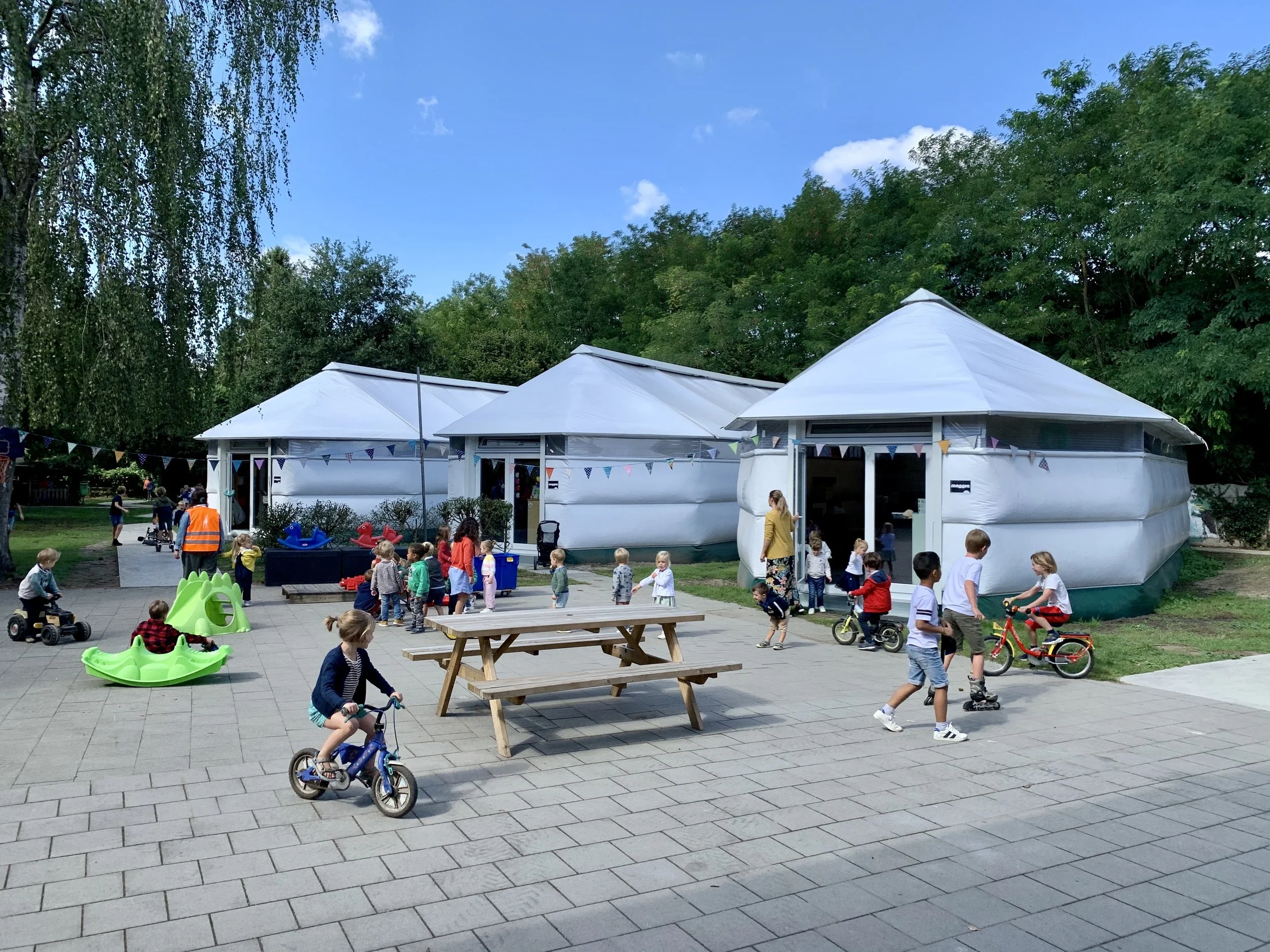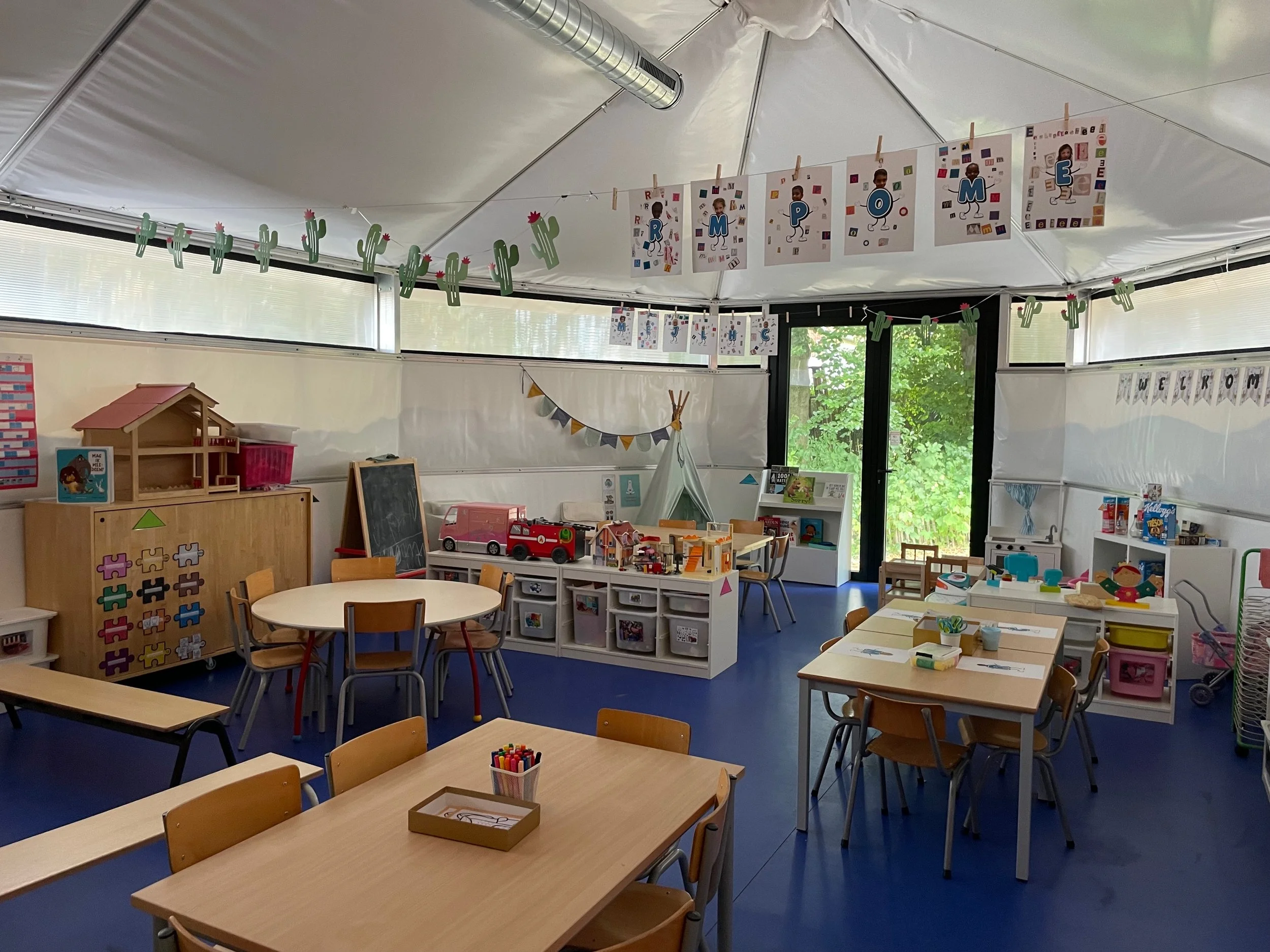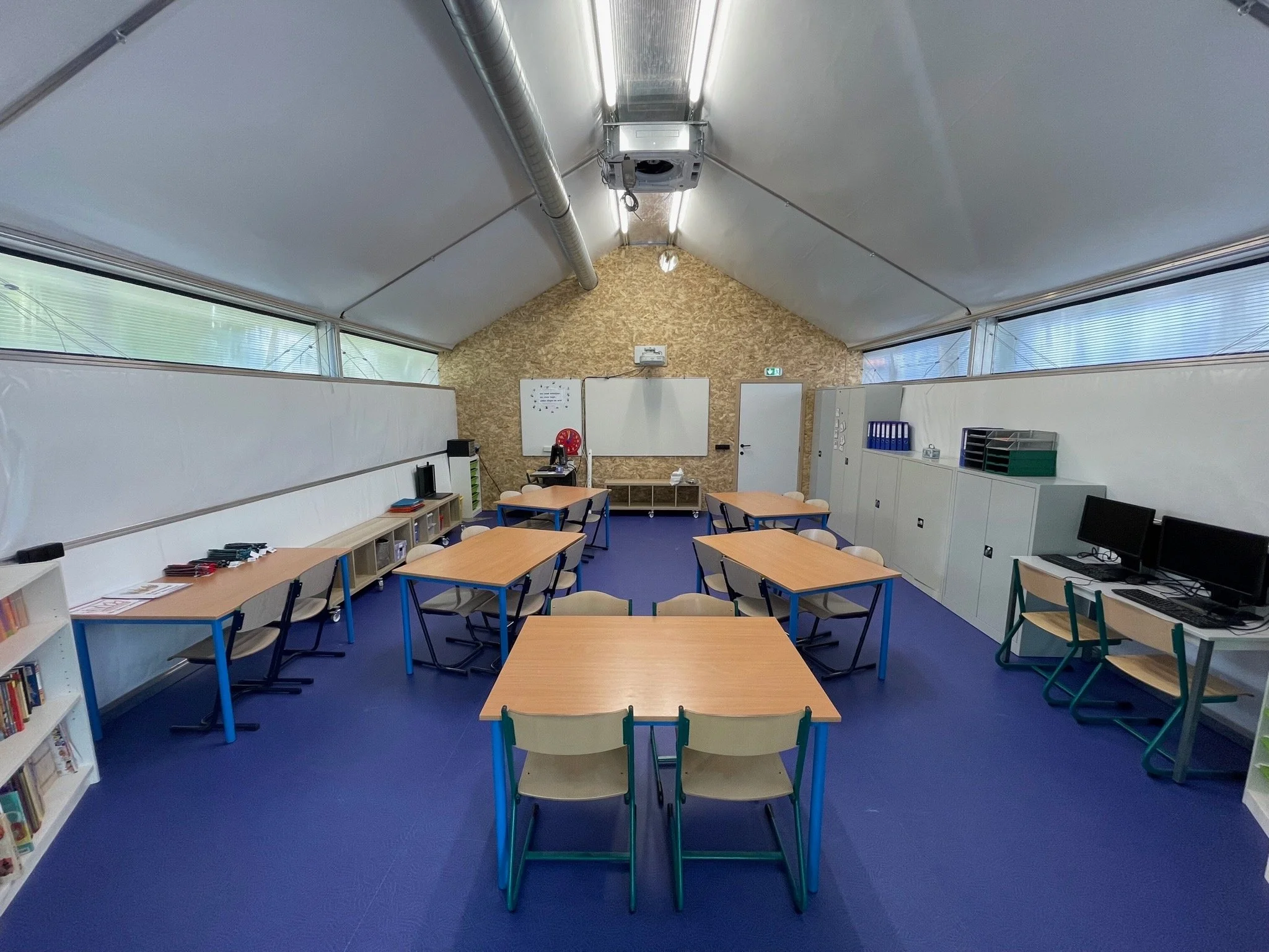 Tijdens de schoolrenovatie creëerden drie grote BOB’s plaats voor zes klaslokalen, gecombineerd met een kleine BOB die werd ingezet als leraarskamer.