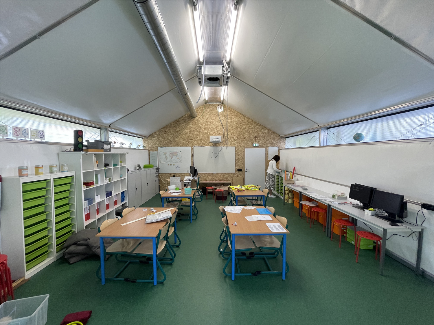 Tijdens de schoolrenovatie creëerden drie grote BOB’s plaats voor zes klaslokalen, gecombineerd met een kleine BOB die werd ingezet als leraarskamer.